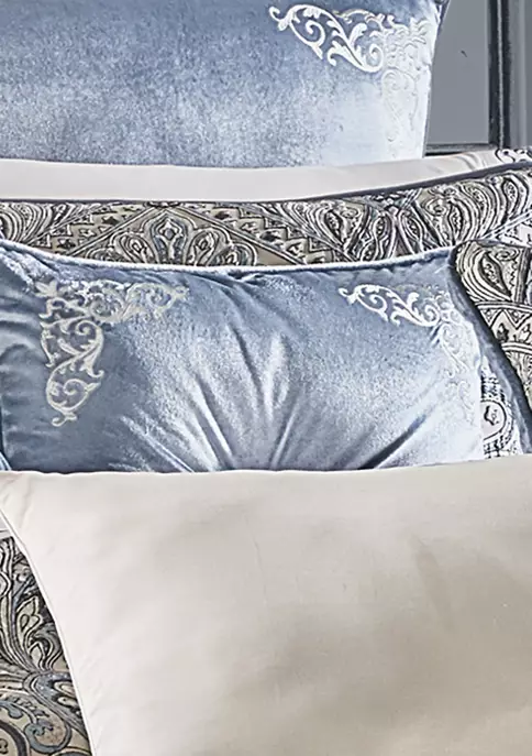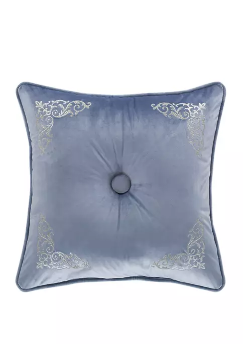 The Alexis 18-inch decorative throw pillow is exquisite with its delicate detailed embroidered scroll border. This beautiful overstuffed square pillow is rich with a powder blue velvet face and reverses and finished with a 0.26-inch powder blue velvet piping for added detail. Pair this pillow with the Alexis bedding set by J. Queen New York for a complete look.