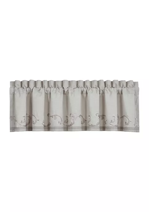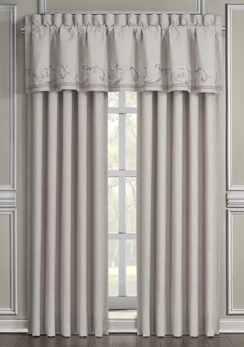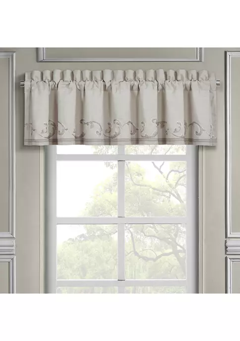 The Angeline straight window valance is beautiful with its lovely beige faux linen base fabric. This simple heathered fabric is embellished with a traditional blush-colored mosaic scroll embroidery along the bottom edge, complementing the classic damask found on the top of the bed. The 3-inch header and 3-inch rod pocket make this valance easy to hang. Pair this valance with the Angeline window panels and bedding by J. Queen New York for a complete look.