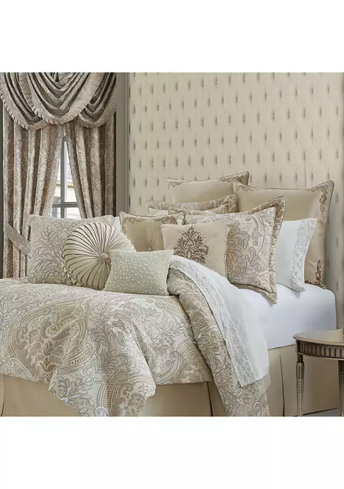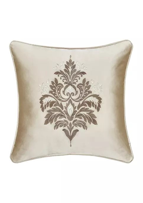 The Belgium 18″ Square Throw Pillow features a solid champagne ground, highlighted by delicate tones of taupe and metallic gold embroidery to create a detailed damask design. Self-fabric piping all around finishes the fine quality accent piece and is made to coordinate with the Belgium bed set.