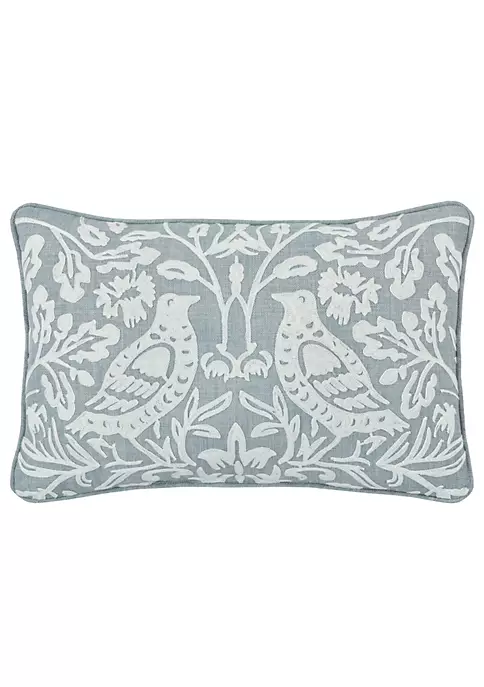 The Blue Garden Boudoir Throw Pillow features an embroidered chinoiserie technique with lovely playful birds in a serene garden scene. This cheerful pillow adds a whimsy Farmhouse charm to your bedroom decor.