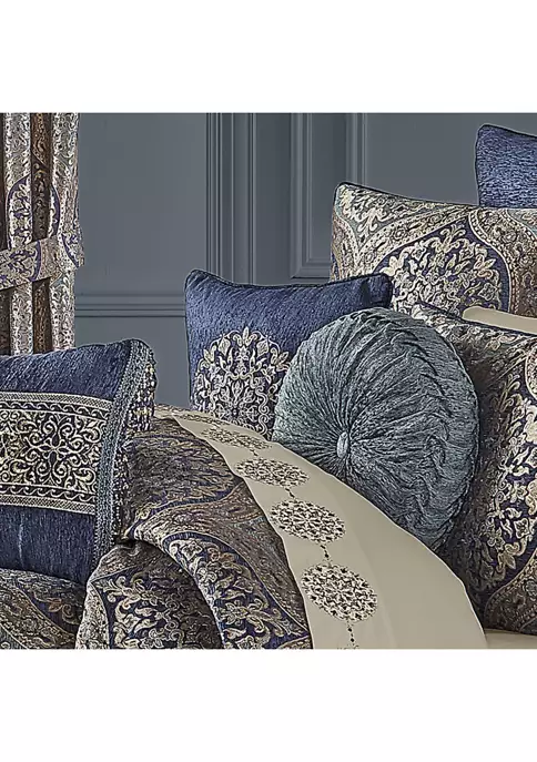 The Botticelli 18 Inch Square Decorative Embellished Throw Pillow is luxurious and elegant. A navy chenille solid base is paired with a detailed medallion embroidery design and accented with metallic yarns. Pair this pillow with the Botticelli Bedding set for a completely elegant look.