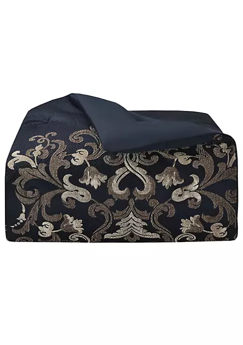 The Caruso 4 Piece Comforter Set is a showstopper, that will add elegance, glamour and luxury to your bedroom decor. The soft silky texture in a classic Royal Blue is rich and shows off the engineered scroll design which is intricately woven in exuberant shades of gold. This stunning over sized filled comforter is truly one that will give you lasting comfort and an array of compliments. Paired with matching shams and a split-corner tailored bedskirt that pulls the beauty all together.