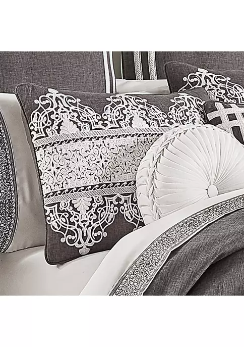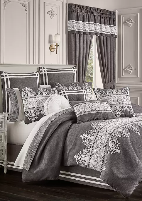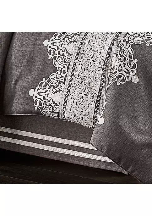 Flint is a beautifully embroidered highly detailed luxury bedding collection from J. Queen New York. White damask embroidery runs horizontally across the heathered charcoal gray faux linen comforter. The oversized comforter is embellished with 1/4-inch piping. The four-piece set includes one comforter and two perfectly matched padded pillow shams with a hidden zipper. The pillow shams are engineered, centering the embroidered damask, and finished with 1/4-inch piping. The bed skirt is solid faux linen with 2 rows of gimp running at the bottom. This ensemble will add designer elegance to your bedroom décor.