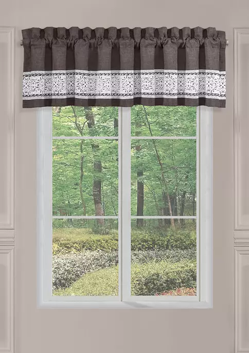 This straight valance from J. Queen New York is made with a faux linen heathered charcoal gray fabric. A white intricately detailed embroidery runs horizontally along the border. The embroidery on the valance creates a harmonious look.
