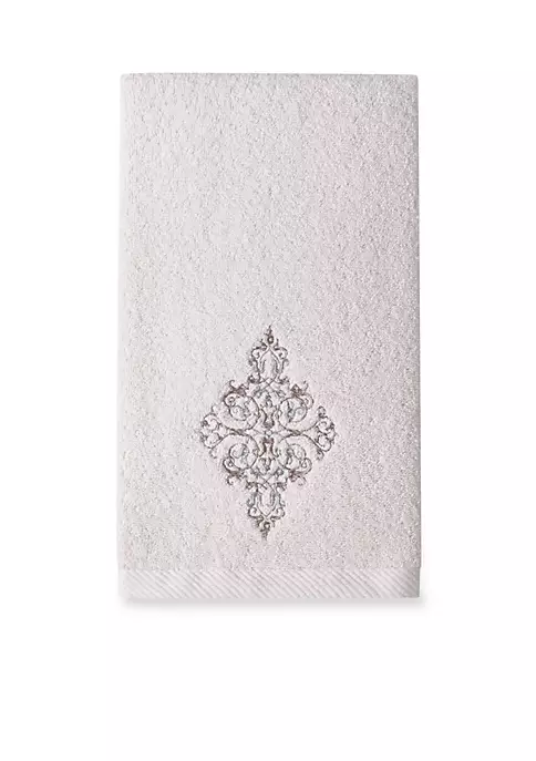 Printed on a unique poly cloth blended with a delicate silver metallic yarn, this towel makes an elegant addition to any bathroom. The shapes are traditional with a unique twist!