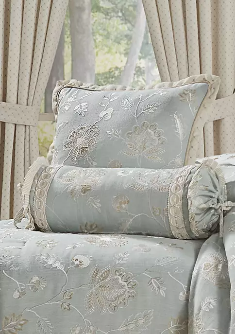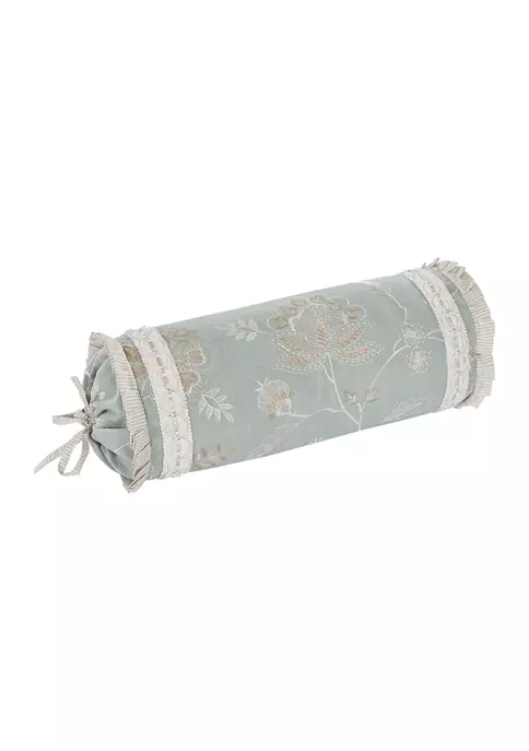 The Garden View neckroll accent pillow is beautifully designed combining a fresh floral embroidery in neutral colors on top of a textured spa blue fabric. The pillow is finished with an embellished trim and pleated stripe and tie details to create a lovely farmhouse look. Pair this luxury accent pillow with the garden view bedding collection to complete the look.