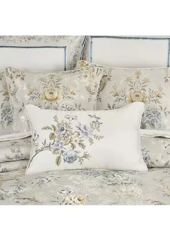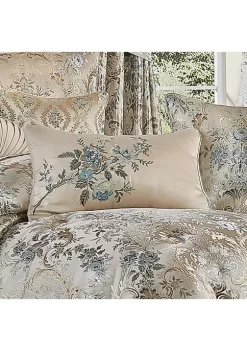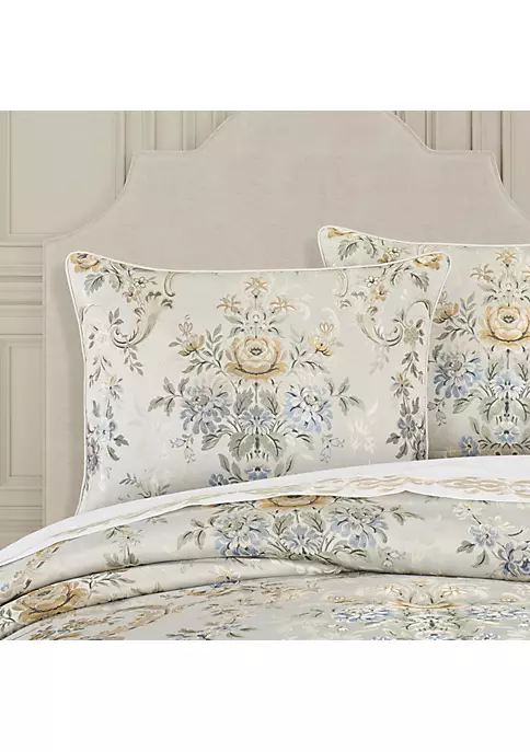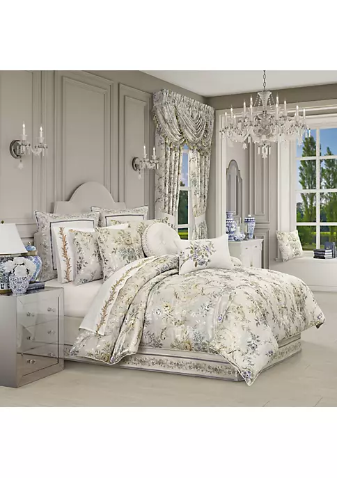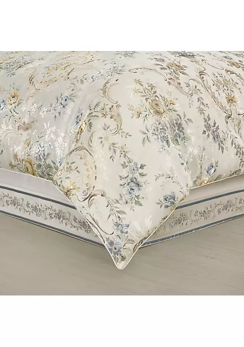 The Genevieve Comforter Set is exquisite with its fine details and timeless appeal. The woven floral large scale jacquard creates a silk-like look in delicate and intricate tones. This beautifully woven floral pattern is highlighted by a stunning color combination of ivory, gold, blue, and homered green leaves. Paired with matching hidden zipper pillow shams and a split corner bed skirt, this oversized ensemble will add elegance to your decor. Pair this comforter set with the Genevieve window treatments, throw pillows, and Euro shams for a complete traditional yet updated look. 1 California King 4Pc. Comforter Set: 96-In. X 110-In., 2 King Sham: 20-In. X 36-In., 1 Cal King Bedskirt: 86-In. X 72-In.