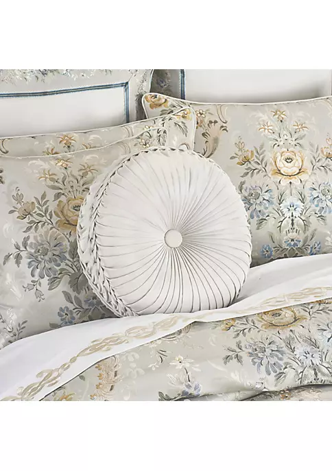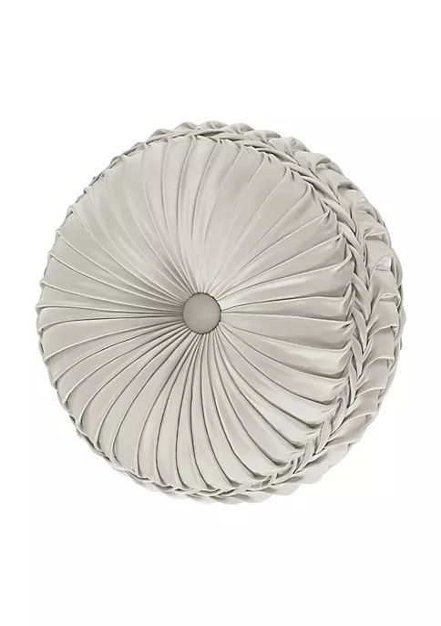 The specially hand-crafted tufted round pillow uses an elegant plush fabric in ivory to create a luxurious accent to your bedroom decor. The pillow is completely pleated all the way around and a large satin button on both sides gives the pillow a deeply tufted appeal. The Genevieve Comforter Set and Window Treatments are available separately. 1 Tufted Round Decorative Throw Pillow: 15-In. X 15-In.
