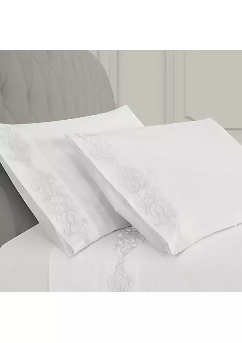 Add a luxurious foundation to your bed with the Imperial – Sheet Embroidered Sheet Set. Featuring an updated stylized scroll embroidery design, detailed with a darker stitch outline for a stunning shadow effect and further definition. Crafted with plush 100% Cotton fabric that feels cool, soft to the touch, and breathable for a rejuvenating night’s sleep. The sheets are available in multiple colors to coordinate beautifully with the Bedding collections and are machine washable for easy care.