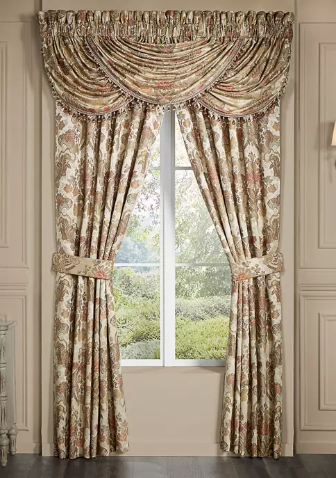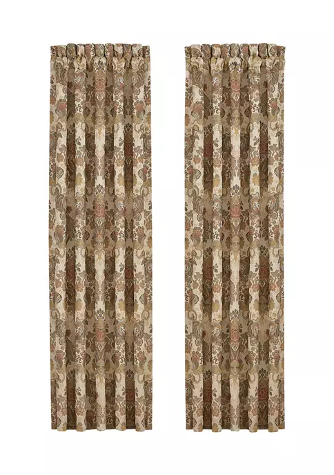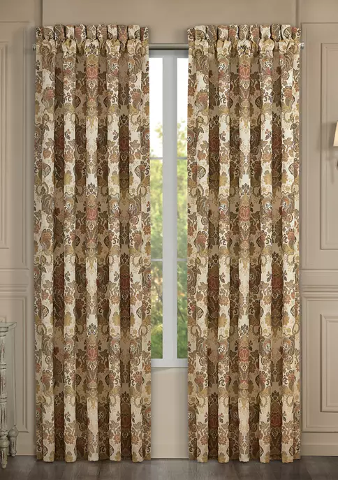 The Juliette window panel pair is exquisite with its fine details and bold use of terracotta, taupe, and beige tones. This beautiful woven jacquard floral fabric is detailed and sophisticated. These lined panels include tiebacks to create an open airy look, and the panels provide ideal light-filtering shade to keep your bedroom comfortable throughout the day. The 3-inch header and 3-inch rod pocket make these panels easy to hang. Pair these panels with the Juliette window valance and bedding collection by J Queen New York to complete the look.