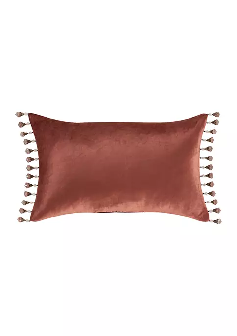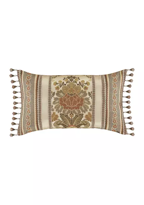 The Juliette boudoir throw pillow is beautifully pieced with a centered woven jacquard floral, a jacquard border stripe, and beige satin fabrics. This decadent pillow is embellished with a lovely crystal tassel fringe to create a luxurious traditional look. Pair this 13 in x 22 in statement piece pillow with the Juliette bedding set by J Queen New York for a completely elegant style.