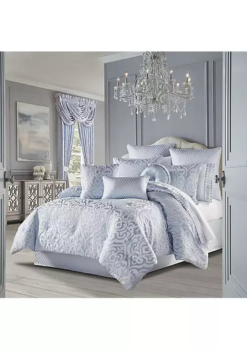 The Liana 18″ Decorative Throw Pillow is exquisite with its sophisticated use of powder blue tones. This beautiful square accent pillow is rich with an ornate, large scale puff damask centered on the front and solid silver on the back. This pillow is reversible, with a soft satin finish on each side and finished with satin piping for a traditional luxury look.