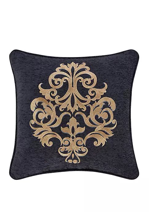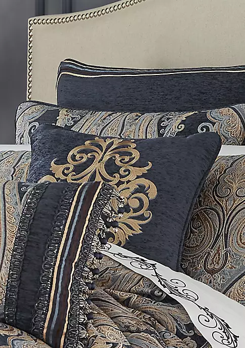 The Luciana 18-inch decorative pillow from J by J Queen New York is perfectly mitered with a luxurious striped boarder of chenille around all sides in shades of indigo, pale blue, brown, camel and cream.