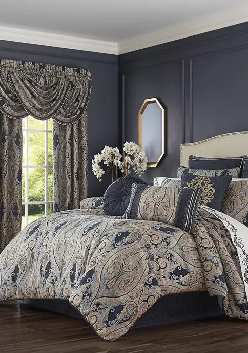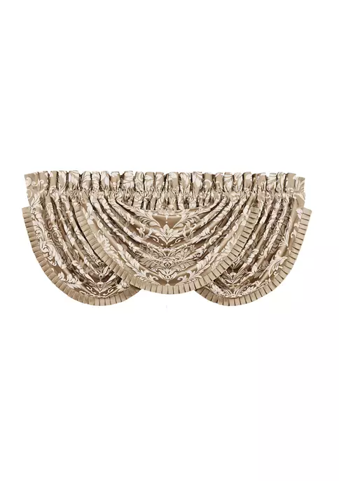 Designed for the ultimate look of luxury, the Lugano waterfall window valances use a woven grand damask fabric that is carefully trimmed with a pleated stain flange. They are lined and have 3” header with 3” rod pocket for easy setup. Window shown with three waterfall valances (each sold separately).
