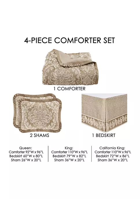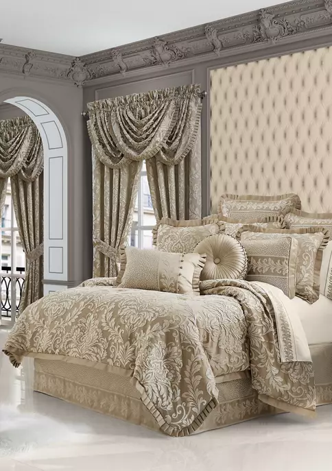 The Lugano Comforter Set features an opulent and grand scale French damask design in stunning sand colors. The unique fabric is finished with a special washing process giving it a relaxed and three-dimensional quality. This luxurious ensemble is designed to give interior decorator appeal to any bedroom. All the items in the ensemble have elegant accents and are carefully cut and sewn to ensure attention to detail and superior quality.
