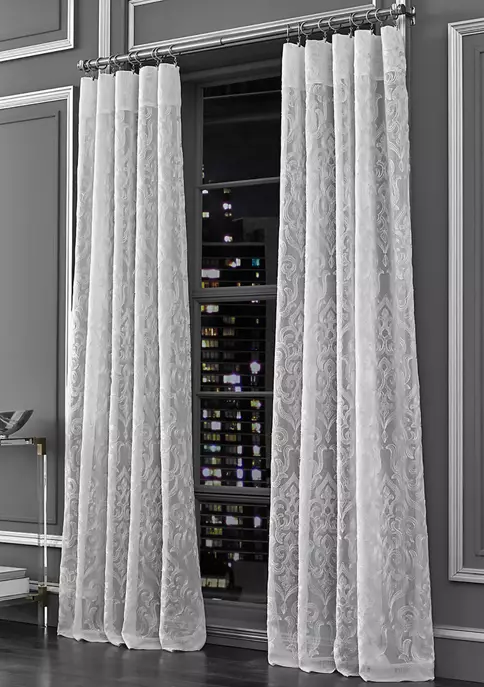 The Luxembourg Window Sheer panels feature a gorgeous medallion motif in a soft silver color. This classic traditional sheer offers an airy lightweight appearance, and allows light to flow gently into the room for a desirable soft and dreamy look.