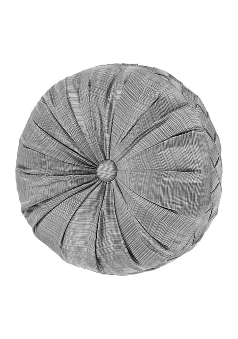 The tufted round pillows use the same luxurious silver stria fabric to create a one of a kind accent to the Luxembourg quilt program. These unique pillows are sewn by hand with fabric covered buttons on both sides. Special craftsmanship include hand pleating and a basket weave gusset for intricate detail.