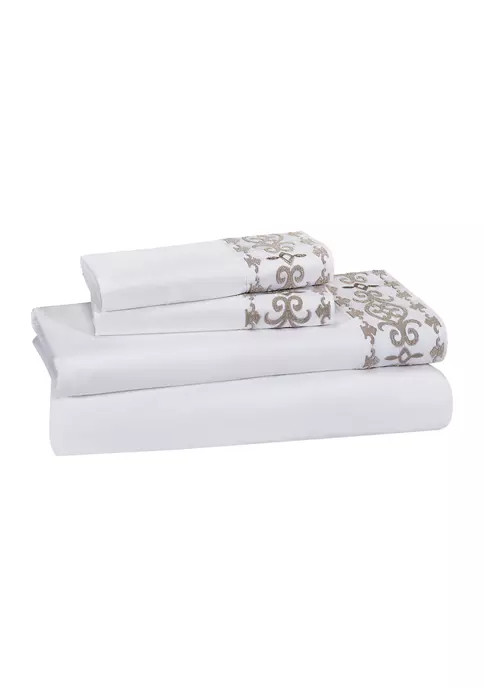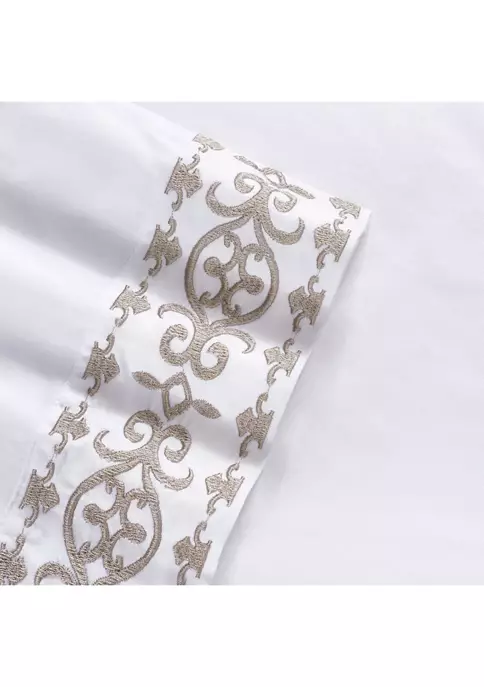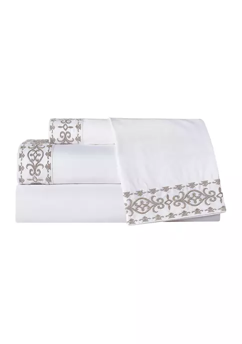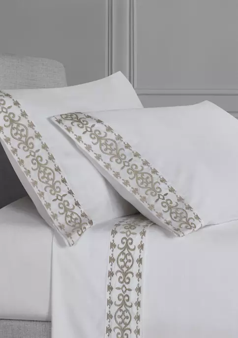 Add a luxurious foundation to your bed with the Luxembourg Embroidered Sheet Set. Featuring an opulent medallion motif on a plush 100% Cotton sateen fabric that feels cool, soft to the touch, and breathable for a rejuvenating night’s sleep. The sheets coordinate with the Luxembourg collection and are machine washable for easy care. 1 Queen 4Pc. Sheet Set: 80-In. X 60-In., 1 Flat Sheet: 102-In. X 90-In., 2 Pillowcase: 30-In. X 21-In.
