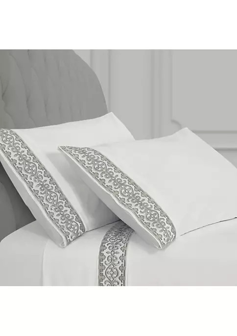 Add a luxurious foundation to your bed with the Majestic – Sheet Embroidered Pillowcase Pair. Featuring an ornate embroidered scroll border, detailed with a darker yarn outline for a stunning shadow effect and further definition. Crafted with plush 100% Cotton fabric that feels cool, soft to the touch, and breathable for a rejuvenating night’s sleep. The pillowcases are available in multiple colors to coordinate beautifully with the Bedding collections and are machine washable for easy care.