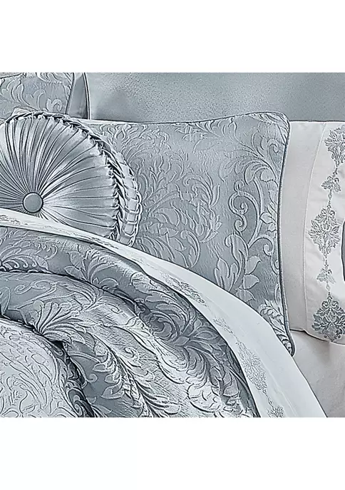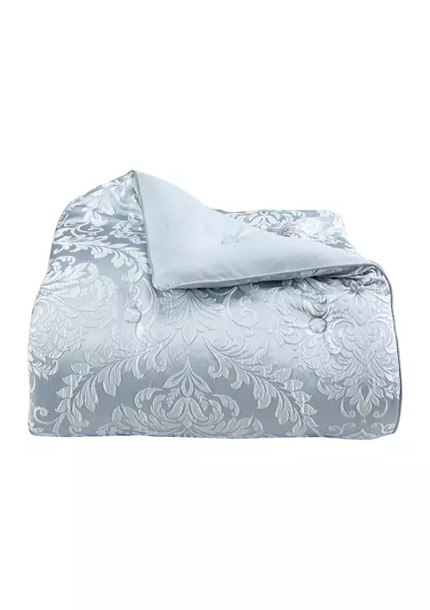 Begin to create your dream room with the luxurious Malita 4 Piece Comforter Set. The comforter spotlights a silvery white damask pattern against a lovely powder blue color, woven to create a 3D effect. The reverse fabric and bedskirt are made with a matching solid powder blue. Attention to detail ensures that every comforter is cut at the same point to insure that each will be the same. The pillow shams are cut identically, centering the grand damask design. Coordinate window and accessories are sold separately.
