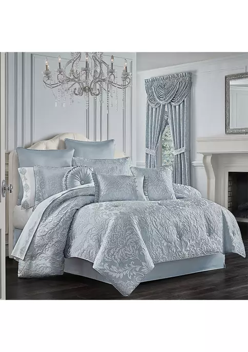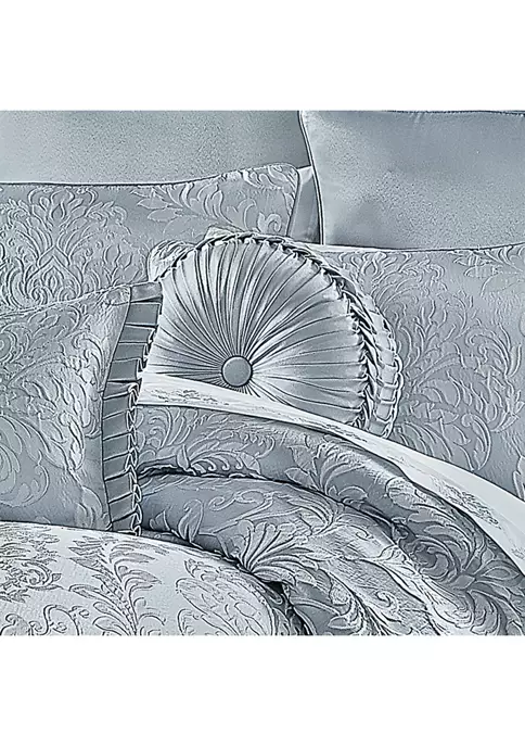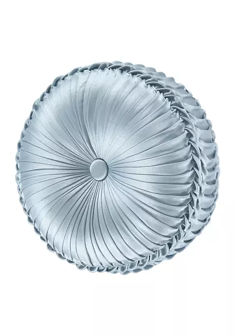 The specially hand-crafted tufted round pillow uses an elegant satin fabric in powder blue to create a luxurious accent to your bedroom décor. The pillow is completely pleated all the way around and braided on the gusset. A large satin button on both sides gives the pillow a deeply tufted appeal. The Malita Comforter Set and Window Treatments are available separately.