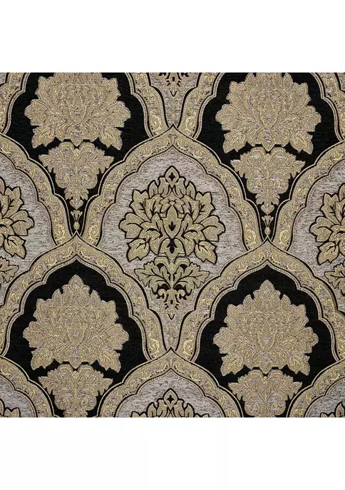 The Melina 4 Piece Comforter Set is exquisite with its attention to detail and sophisticated use of silver and black tones. A beautiful chenille woven damask pattern combined with gold metallic yarns creates a unique designer spun-gold effect. Finished with a tri-color twist trim and reverses to a dyed-to-match solid black plush sleep surface. Paired with matching hidden zipper pillow shams and an engineered split-corner bedskirt, this oversized ensemble will add opulence to your home decor. Pair this collection with the Melina throw pillows and window treatments to complete the look.