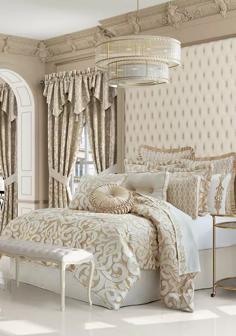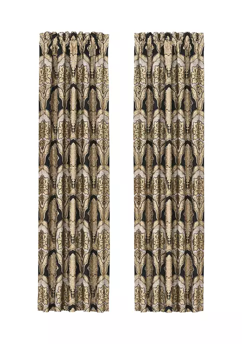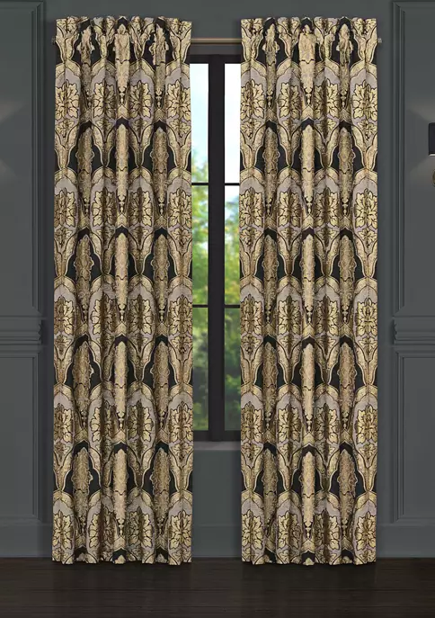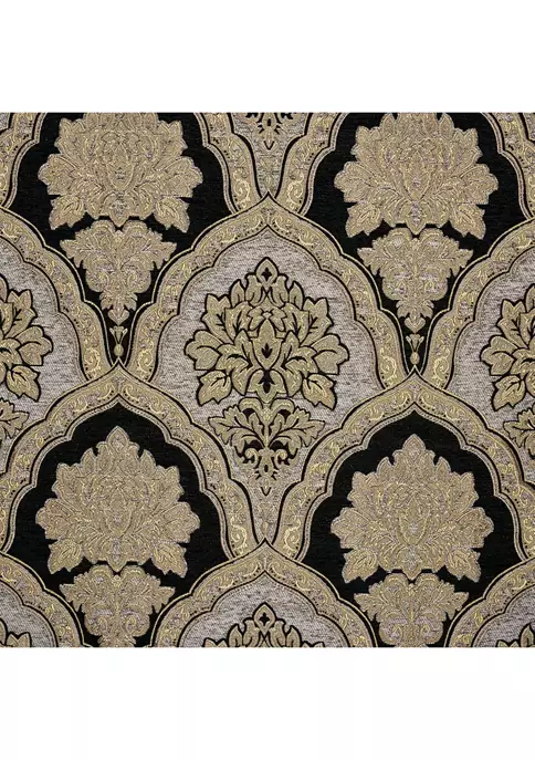 The Melina Window Panel Pair is exquisite with its fine details and sophisticated use of black and silver hues. The beautiful woven jacquard chenille damask features a touch of gold metallic yarns, creating a spun-gold effect. These lined panels keep your room cool and provide ideal room-darkening shade for the perfect finishing touch to complete this traditional look. They also include tiebacks for an open airy look and the 3″ header and 3″ rod pocket make these panels easy to hang.