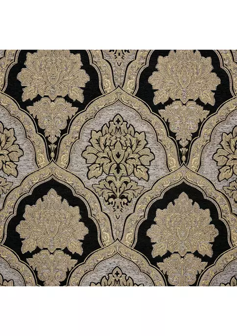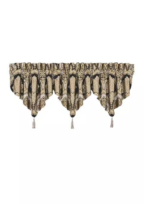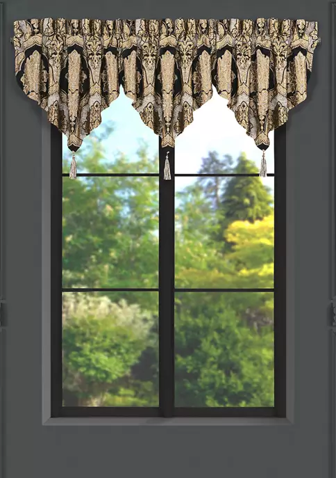 The Melina Ascot Valance is exquisite with its ornate woven damask design in silver and black tones. This beautiful chenille valance is detailed with gold metallic yarns creating a spun gold effect. Embellished with a 4” mingled tassel, to add an elegant touch to this grand design. The 3″ header and 3″ rod pocket make this valance easy to hang. Window shown with three valances (each sold separately).
