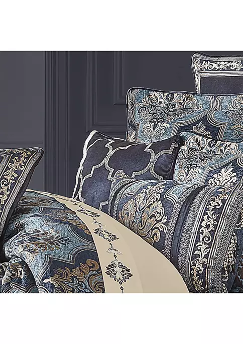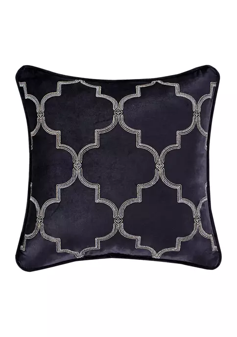 The Middlebury 18 Inch Square Decorative Embellished Throw Pillow is luxurious and elegant. Featuring an indigo rayon cotton velvet with an embroidered geometric design in tones of metallic gold and reverses to a solid indigo velvet. Pair this pillow with the Middlebury Bedding set for a completely elegant look.