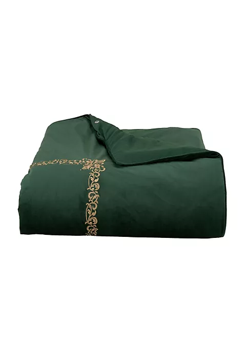 Decorate your home decor for the holidays with the Noelle Duvet Cover Set. Crafted with a detailed ornate scroll embroidery, which frames the duvet along the sides. The plush velvet is paired with embroidery thread that is layered with metallic gold for added shimmer and elegance. The included pillow shams also feature the golden embroidery and the duvet is finished with hidden button closures and piping along the trim for a fine finish. Complete the Noelle collection and celebrate the season in style with luxurious Holiday bedding, bath and window from J. Queen New York. Available in stunning crimson red or evergreen color options. 1 Full/Queen Duvet Cover 3Pc. Set: 98-In. X 90-In., 2 Standard Sham: 20-In. X 26-In.