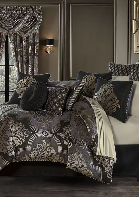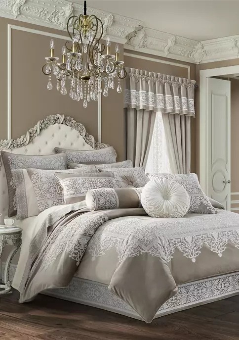 The Opulence Comforter set is a beautifully embroidered bedding ensemble that adds understated sophistication to your home decor. Delicately detailed with a cream embroidery scroll pattern that is framed with a fine-line lattice border, across a plush linen color velvet base fabric. The oversized comforter is embellished with 1/4″ piping for added detail. The four piece set includes one comforter and two perfectly matched padded pillow shams with a hidden zipper closure and a tailored bedskirt with split corners and a 15″ drop.