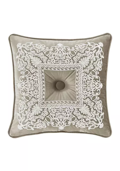 The Opulence 18 Inch Decorative Throw pillow features a plush solid velvet fabric in a lovely linen color. Further detailed with a deeply tufted button accent and crewel embroidery framing the accent pillow. The reverse of the pillow is crafted with a solid velvet in a cream color and is finished with 1/4″ piping in a linen velvet.