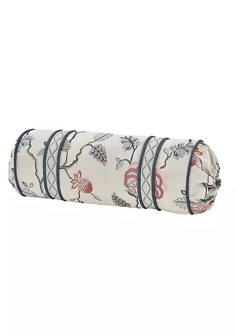 The Parkview Bolster Accent Pillow is beautifully designed, combining a lush floral embroidery in colors of coral, blush, taupes and navy blue sitting on top of a natural linen textured fabric. The pillow is trimmed with solid navy cord and frames a diamond embroidery on both sides of the pillow.