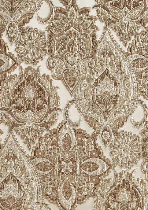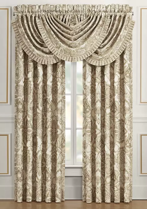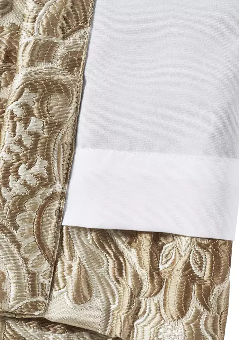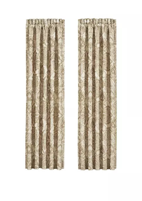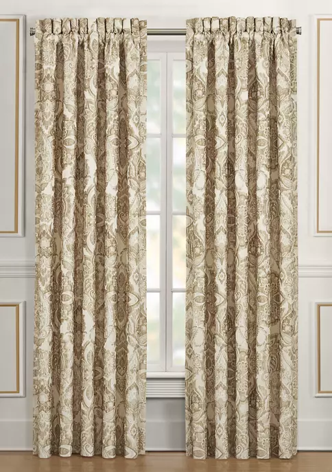The Sandstone window panel pair is exquisite with a sand-colored traditional jacquard damask pattern. These lined panels include tiebacks and are the perfect finishing touch to complete a traditional look while filtering light and keeping you comfortable throughout the day. The 3-inch header and 3-inch rod pocket make these panels easy to hang. Pair these window panels with the sandstone window valance and bedding set by J. Queen New York for a complete look.