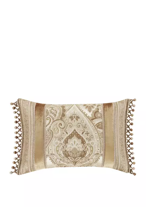 The Sandstone boudoir throw pillow is beautifully constructed with a traditional woven damask pattern centered, complemented by a bordering beige velvet and lovely jacquard stripe. The pillow is finished with a coordinating gimp and multi-colored tassel ball fringe. Pair this 13×21 inch pillow with the sandstone bedding set by J. Queen New York for a complete traditional luxury look.