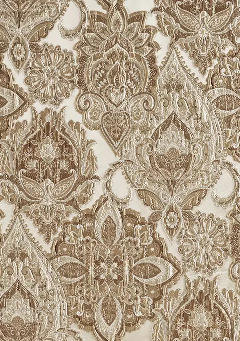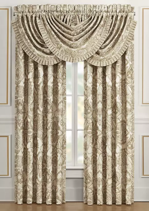 The Sandstone waterfall window valance is beautiful and sophisticated with a sand-colored traditional woven jacquard damask pattern. This beautiful woven damask window treatment is finished with a lovely ruffle that features a coordinating traditional woven jacquard stripe, creating the perfect finishing touch to this grand design. The 3-inch header and 3-inch rod pocket make this valance easy to hang. Pair the window valance with the sandstone window panel pair and bedding set by J. Queen New York for a complete look. The window is shown with three waterfall valances (each sold separately).