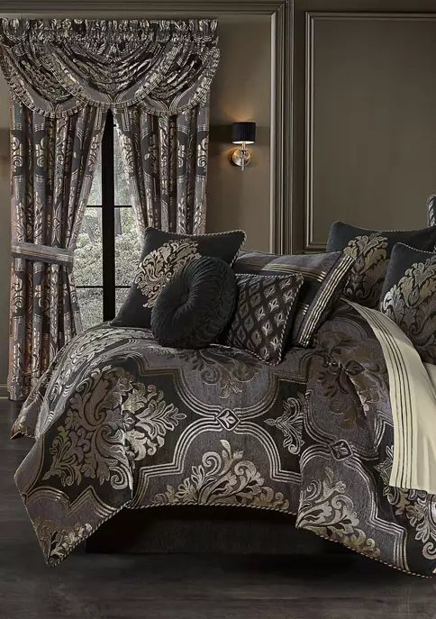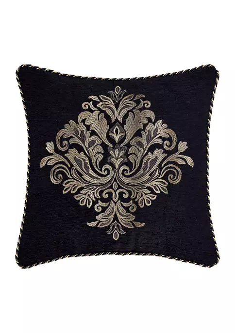 The Savoy 20 Inch Throw Pillow features an engineered embroidered damask that custom fits the dimensions perfectly on the center of the pillow. The embroidered damask uses metallic gold yarns to highlight the black and pewter design and create shimmer and added dimension to the bedding ensemble. The reverse is constructed with a solid black chenille and is finished with a tri-color twist cord.