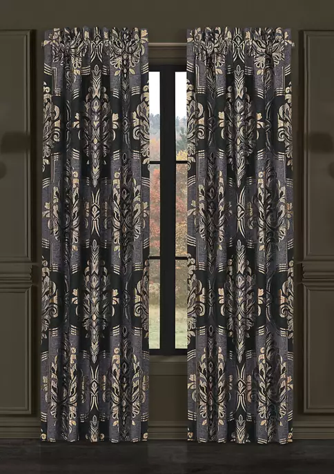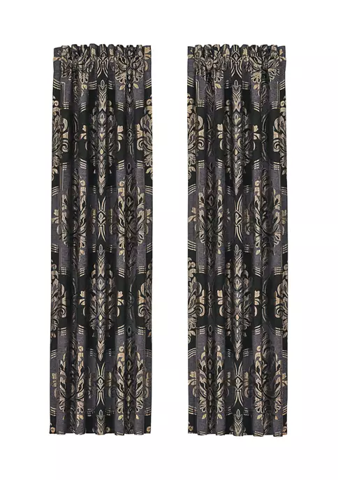 The Savoy Window Panel Pair is exquisite with its fine details and dramatic use of black, pewter, and gold hues. A highly engineered framed chenille iron gate damask is centered and cut so each panel is identical and lines up perfectly as a pair. The panels are lined for room darkening privacy, include tiebacks, and the 3″ header and 3″ rod pocket make these panels easy to hang.
