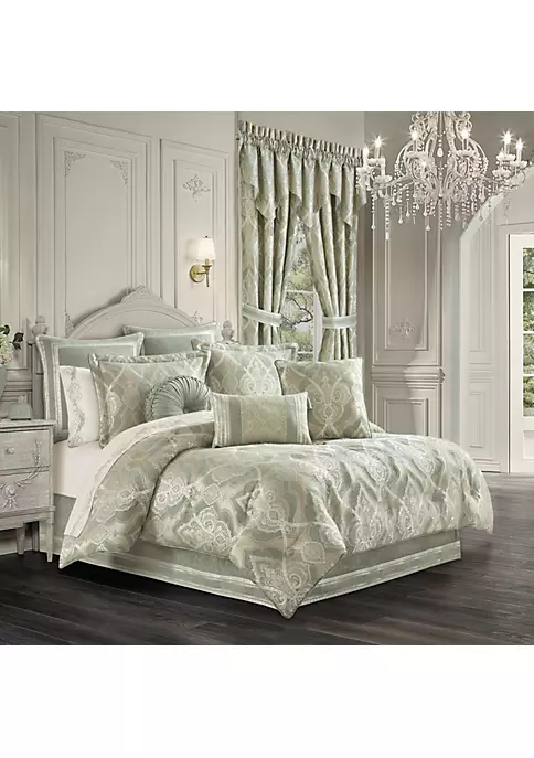 The Sovana 4 Piece Comforter Set is truly a showstopper that will add elegance, glamour and luxury to your bedroom decor. Constructed with a highly detailed woven damask in gorgeous tones of soft sage, champagne, and white; paired with shimmering yarns that adds dimension, luster and a tasteful touch of glam to the design. This stunning oversized and overfilled comforter is truly one that will give you lasting comfort and an array of compliments. Paired with matching shams and a split-corner tailored bedskirt that pulls the beauty all together.