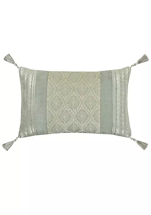 The Sovana Boudoir Throw Pillow features an intricate foulard design in soft sage chenille bordered by engineered vertical stripes. Finished with a tri-colored crystal tassel carefully inserted on all four corners of the pillow.