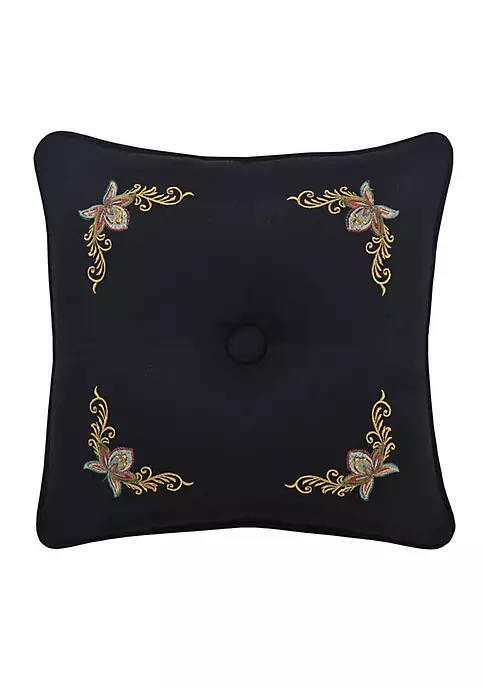 The 16 Inch Throw Pillow is constructed with a tufted fabric covered button accent in a woven black base fabric. The face is embellished with a multicolored floral embroidery placed in all four corners and framed with a 1/4″ piping in solid black.