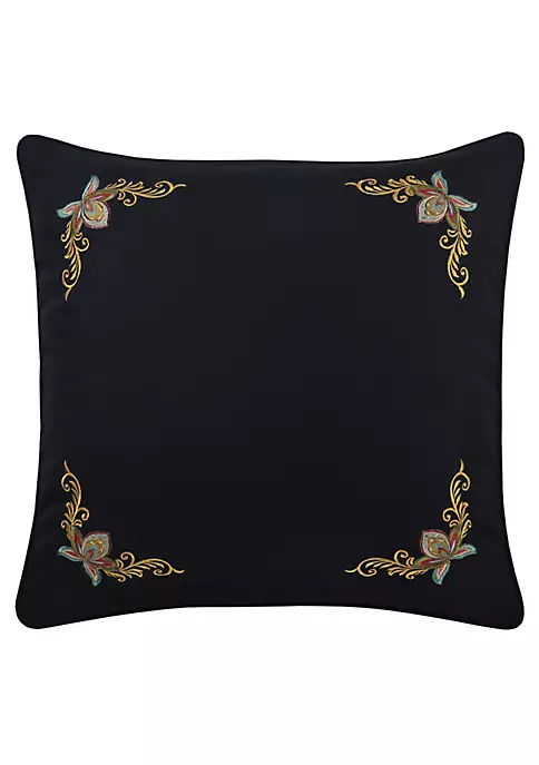 The Euro sham features a woven solid black fabric on the face and reverse. The face is embellished with a multicolored floral embroidery placed in all four corners. The fine details include a hidden zipper and 1/4″ piping for a tailored finish.