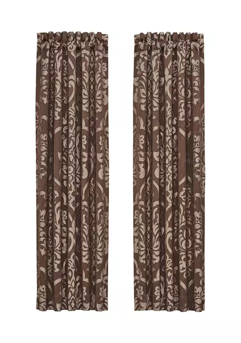 The Surano – Copper Window Panel Pair is simply stunning with its fine details and sophisticated use of soft copper and beige colors. A timeless woven damask pattern is crafted with a unique fabrication process, giving the appearance of an appliqued technique to finish the grand scale design. The panels are lined for room darkening privacy, include tiebacks, and the 3″ header and 3″ rod pocket make these panels easy to hang.