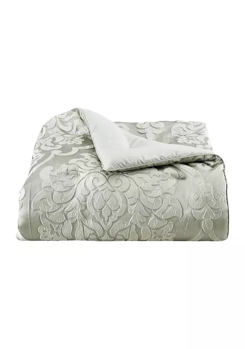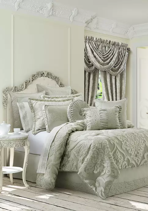 The Surano 4 Piece Comforter Set is simply stunning with a timeless woven damask design and beautiful use of soft celadon green and grey undertones. A unique finishing process is applied, giving the appearance of an appliqued technique for added dimension and texture. Paired with matching hidden zipper shams and a tailored bedskirt, this oversized ensemble will make you feel like a royal. The reverse of this set features a plush solid dyed to match the color in the damask pattern and is finished with a 1/4″ chenille piping.
