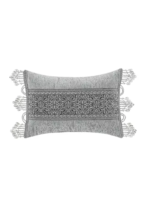 The stunning Tiana Boudoir Pillow is beautifully embroidered with a silver thread on an ice blue design-house quality chenille fabric. This decadent pillow is embellished with a sparkling crystal tassel fringe and braided gimp to add a traditional luxury look to your bedroom decor. Pair this luxurious accent pillow with Tiana bedding set by for a touch of opulence.