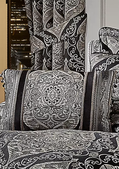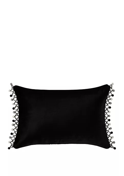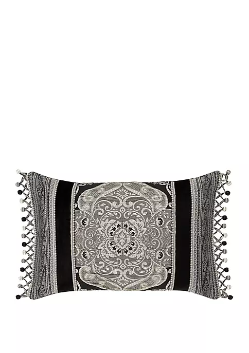 The Vera boudoir pillow from J Queen New York is beautifully pieced with a border jacquard and black velvet fabrics. It’s embellished with a yarn covered ball fringe and braided trim to complete the look.
