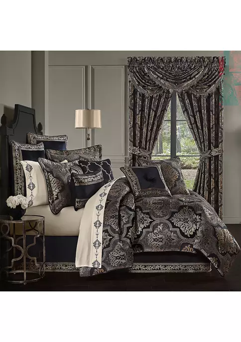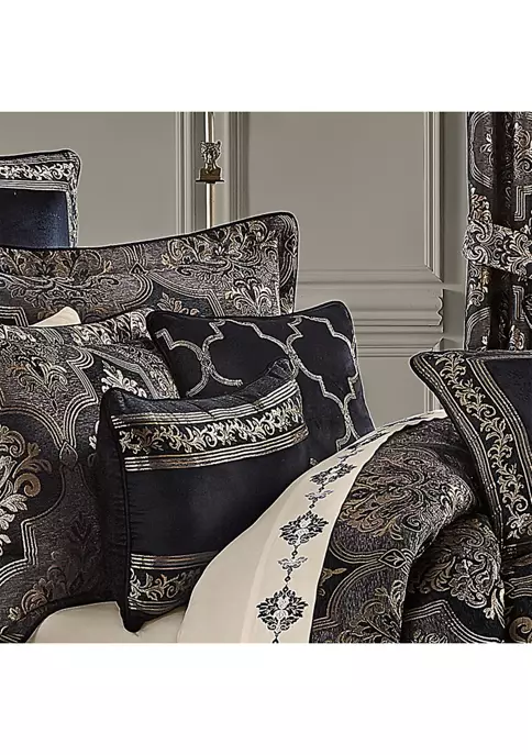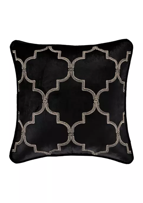 The Windham 18 Inch Embellished Throw Pillow features a black rayon cotton velvet with an embroidered geometric design in metallic gold tones. It reverses to a solid black velvet with piping in black rayon cotton velvet accenting the edge of the pillow. Pair this pillow with the Windham Bedding set for a completely elegant look.