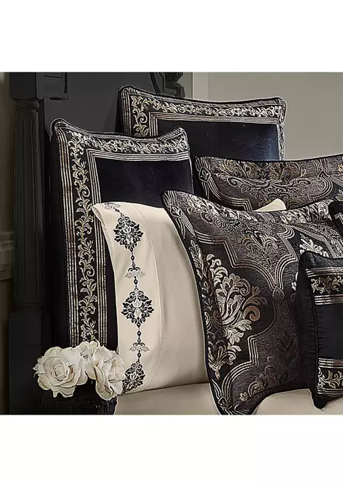 The Windham Euro Sham is a beautiful accent to your bedding décor. Featuring a black velvet in the center with a scroll stripe border that is framed and mitered on all four sides. The sham reverses to a vertical scroll stripe with quarter-inch piping in black rayon cotton velvet. Pair this pillow sham with the Windham Bedding set for a complete look.